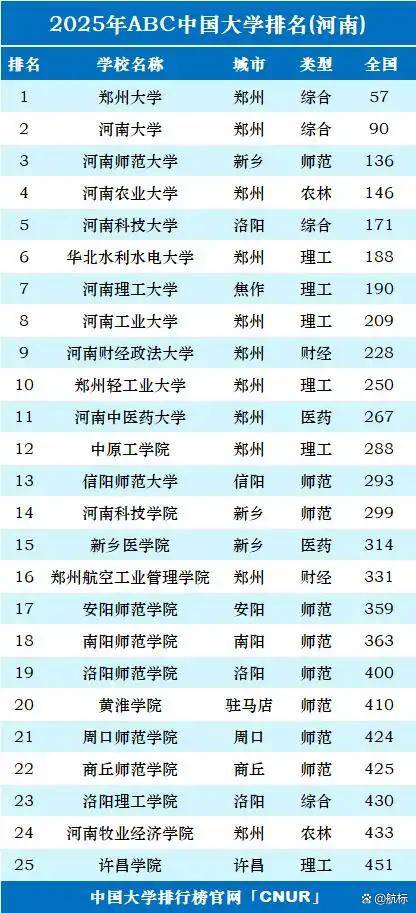 近日,2025年ABC中国大学排名正式发布,河南省高校款式再次成为核心。郑州大学以全国第57名的成就稳居省内榜首,河南大学紧随其后,延续了河南高档教育的“双核驱动”模式。取此同时,多所高校排名发生显著变化:河南理工大学跃居省内第7,全国第190名;洛阳理工学院以全国第430名的成就,较着领先于南阳理工学院的第462名。这场排名洗牌不只反映了各校的成长态势,也了河南高档教育正在学科扶植、人才培育取地区结构上的新动向。