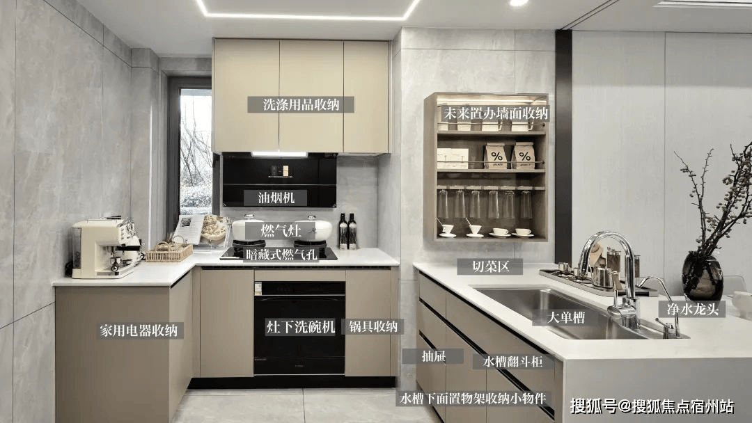 拓展操做空间;其他像预留双开门冰箱位、灶台后背大板砖、顶面线性灯+凉霸等人道化质量细节,也都是交付尺度!